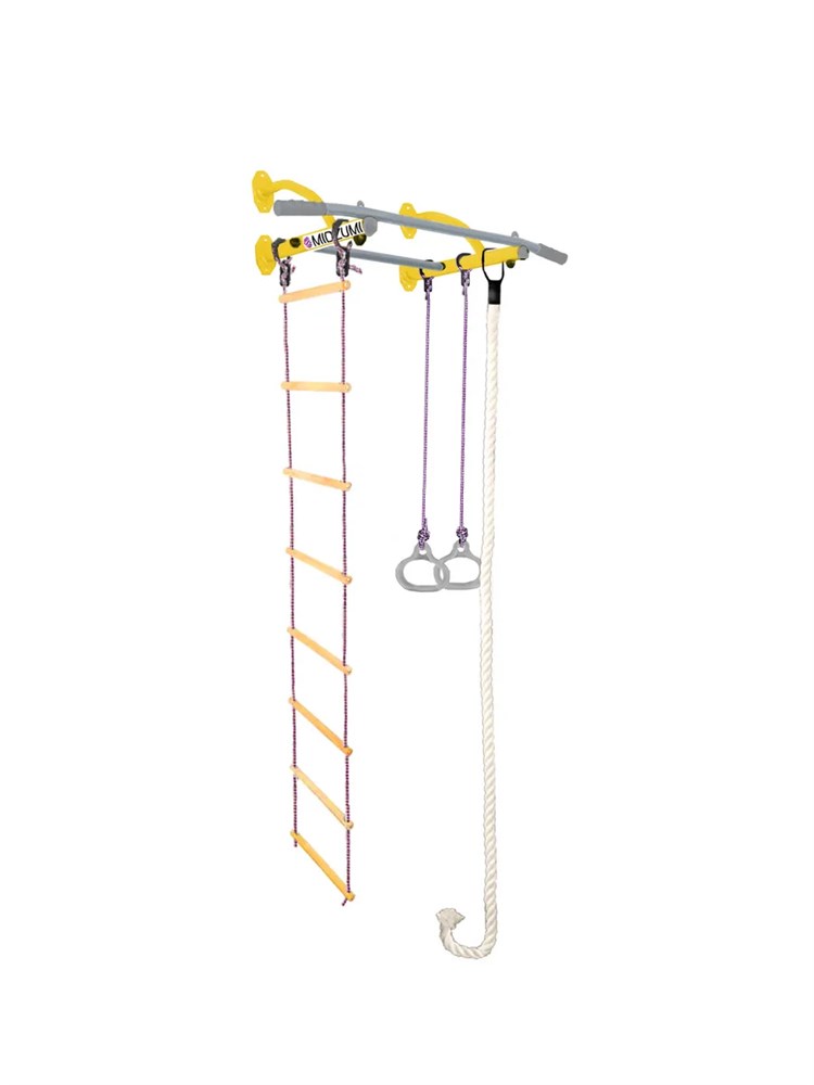 Детский спортивный комплекс — Обрезиненная перекладина — Возможные цвета: лимонный пай, ментоловый сорбет, небесная лазурь, снежный барс — Материал комплекса: металл — Крепление: к стене — Комплектация: лестница веревочная, канат и гимнастические кольца Конструкция: — Высота регулируется во время установки — Габаритные размеры турника(ДхШхВ): 60 х 90 х 30 см — Максимальная нагрузка на комплекс: до 100 кг