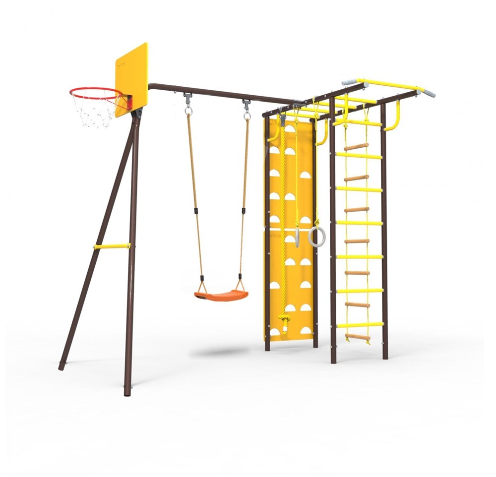 — В комплектацию входят: рукоход, кольца гимнастические, канат, кольцо баскетбольное, лестница веревочная, турник, скалодром, подшипниковые опоры для качели, ступени ПВХ и качели.