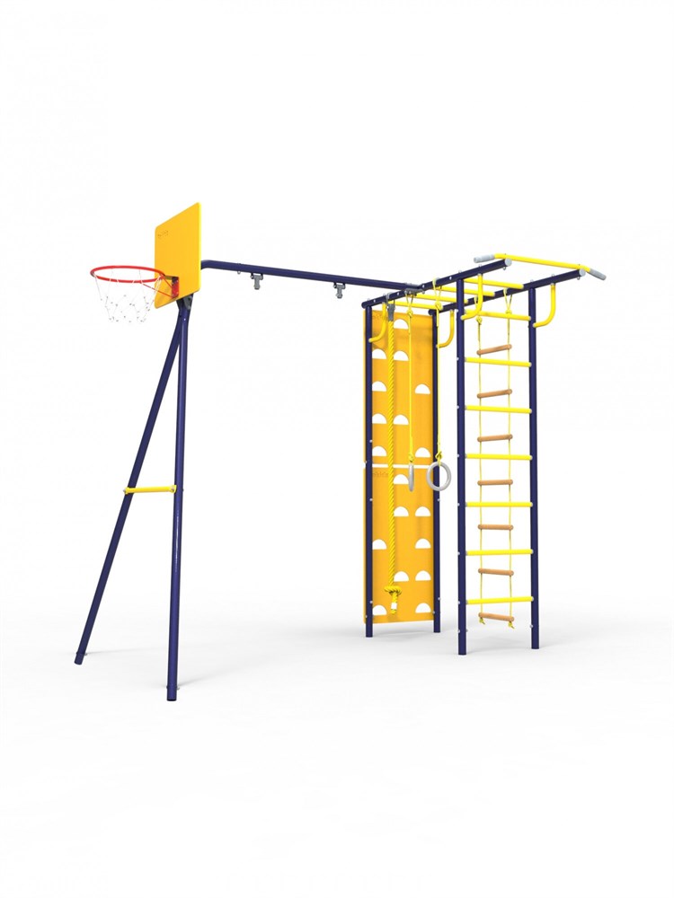 В комплектацию УДСК "Тарзан Мини" входит: рукоход, кольца гимнастические, канат, кольцо баскетбольное, лестница веревочная, турник, скалодром, подшипниковые опоры для качели, ступени ПВХ.