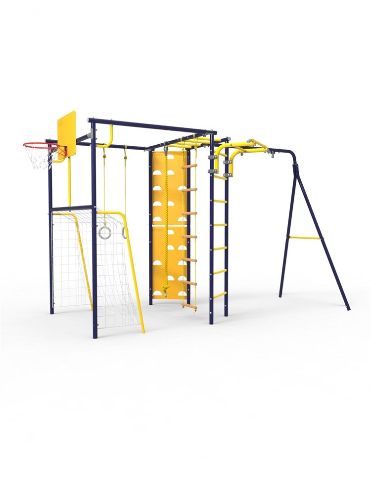 Комплектация комплекса включает скалолазную стенку, веревочную лестницу, гимнастические кольца, трапецию, канат, турник, баскетбольное кольцо, рукоход, ворота.