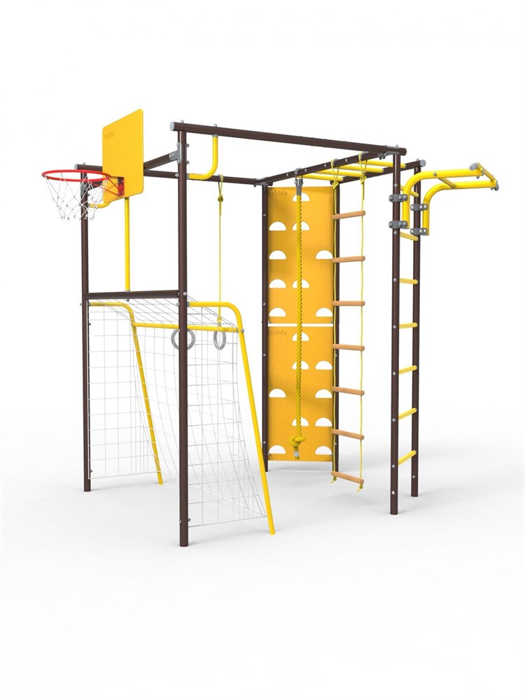 В комплектацию УДСК "Атлет-Т" входит: ворота, скалодром, кольца гимнастические, канат, кольцо баскетбольное, лестница веревочная, турник, регулируемый по высоте, рукоход, ступени ПВХ.