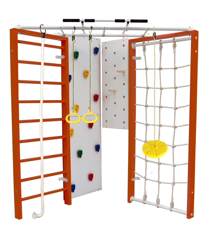 В комплектацию шведской стенки входят турник, канатный лаз, скалодром, пегборд, канат, кольца и лиана. Турник выдерживает нагрузку до 120 кг, а навесное оборудование - до 100 кг. Допустимая нагрузка на скалолаз, пегборд, канатный лаз и навесное оборудование составляет 50 кг.