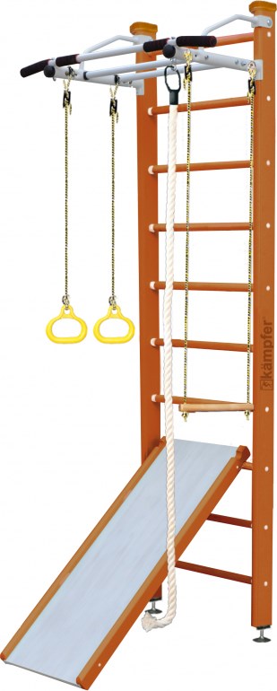 Домашний спортивный комплекс Kampfer Ride Ceiling это новинка на основе одной из самых популярных моделей из линейки деревянных ДСК Kampfer в цветовой гамме на выбор, что позволяет подобрать нужный оттенок под дизайн помещения. Модель Kampfer Ride включает в себя классическую шведскую стенку, металлический турник и набор из самых популярных навесных аксессуаров канат, кольца, трапецию, а также новинку двухсторонний скат-скалолаз. Крепкий металлический турник выдерживает нагрузку до 120 кг, подходит как детям так и взрослым. Навесное оборудование Kampfer на прочных тросах выдерживает нагрузку до 100 кг. Особенностью шведской стенки Kampfer Ride является двух сторонний скат-скалолаз имеющий с одной стороны гладкую поверхность, а с другой несколько деревянных зацепов. Малышам очень нравится - лазить по скалолазу и скатываться с мини-горки. Скат-скалолаз подходит для детей в возрасте от 7 месяцев до 4 лет, устанавливается на ступени шведской стенки и выдерживает максимальную нагрузку до 50 кг.