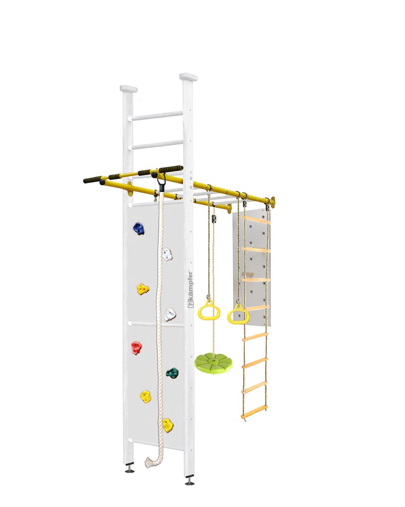 Домашний спортивно-игровой комплекс Kampfer Joy - это новинка из линейки деревянных ДСК Kampfer. Уникальная конструкция Kampfer Joy включает в себя скалолазную стенку на двух стойках, металлический турник с рукоходом и набор из самых популярных навесных аксессуаров - канат, кольца, веревочную лестницу, пластиковую лиану, а также новинку деревянный пегборд. Крепкий металлический турник выдерживает нагрузку до 120 кг, подходит как детям так и взрослым. Навесное оборудование Kampfer на прочных тросах выдерживает нагрузку до 100 кг. Допустимая нагрузка на скалолазную стенку, пегборд 50 кг. Особенностью спортивно-игрового комплекса Kampfer Joy является уникальная конструкция, совмещающая в себе и пристенное и распорное крепление, большой двойной скалолаз имеющий 8 пластиковых зацепов. Малышам очень нравится - лазить по скалолазу, забираться вверх по веревочной лестнице, перебираться по пегборду, висеть на канате и качаться на лиане - играя одновременно тренироваться выполняя все необходимые для физического развития упражнения. Инновация в домашних комплексах - столь сейчас популярные пегборд и скалолаз! Пегборд – это спортивный тренажер-доска со специальными отверстиями с переставляемыми колышками, а скалодром это доска с яркими пластиковыми зацепами имитирующими камни на скале. Данные тренажеры отлично подходят для скалолазных тренировок и занятий кроссфитом, они призваны имитировать движения альпиниста при подъеме по скалам. Несмотря на трудность тренировочного процесса, усилия дают заметный видимый эффект для развития силы и координации рук, мышц спины и пресса. Конструкция игрового комплекса Kampfer выполнена из натурального дерева, все края деталей немного скруглены обеспечивая большую безопасность для ребенка. Крепление враспор между потолком и полом и к стене это крепкая и надежная конструкция, но потолок и стены не должны быть из хрупких материалов, таких как гипсокартон (навесные) и вагонка. Для того, чтобы уберечь Ваших детей от ушибов при падениях и прыжках рекомендуем приобрести гимнастический мат.